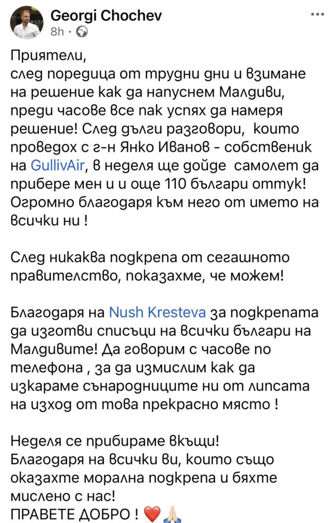 “Организираме чартърен полет за неделя за българите, които са блокирани в Малдиви. Първоначалната ни договорка беше да осъществим полета още на 3 март, но Индия затвори въздушното си пространство и възможността пропадна. Над 120 българи към момента са изявили желание да се качат на самолета.”, заяви за Bgtourism.bg Кирил Стамов – управител на “Фанагория Травел”.