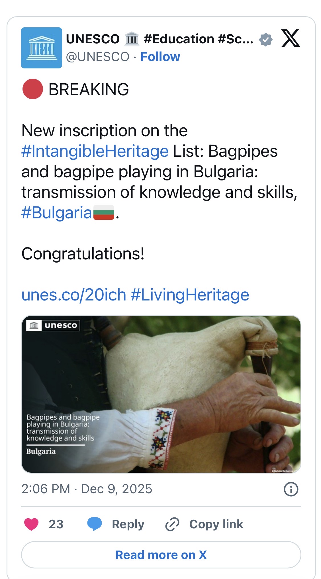 В изявлението се подчертава: „Нов запис в Списъка на нематериалното културно наследство: Гайди и гайдарство в България: предаване на знания и умения, България. Поздравления!“.