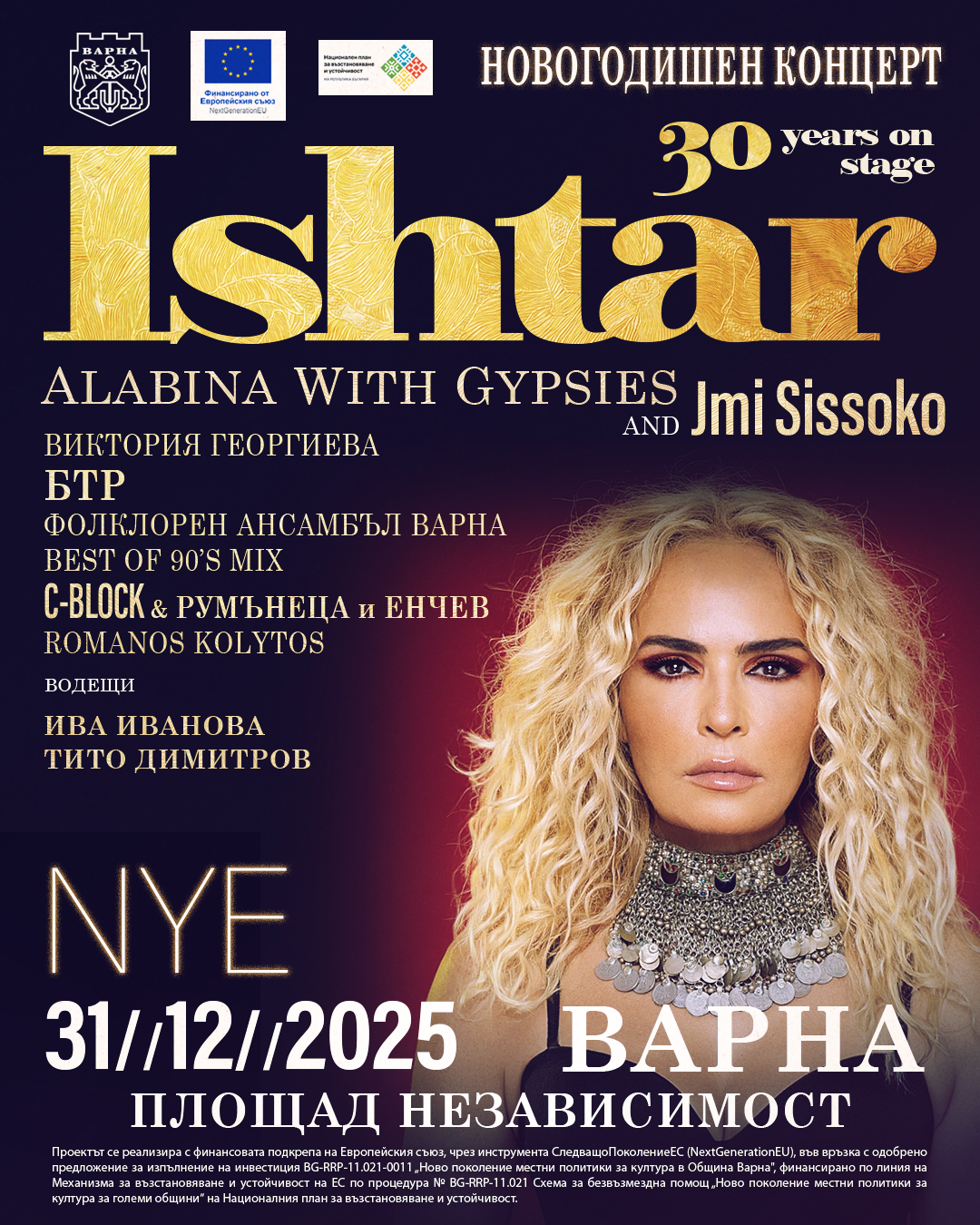 Варна. Варна посреща 2026 година със световноизвестната изпълнителка Ищар. Певицата ще стартира международното си турне, с което отбелязва 30 години на музикалната сцена, именно от морската столица. Тя ще излезе пред публиката заедно с формацията The Gypsies and Jimi Sissoko – познати с изпепеляващите си ритми, завладяваща енергия и незабравимата атмосфера, която създават.