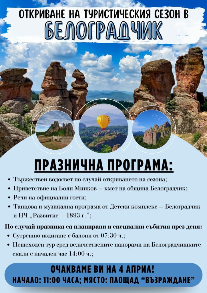 Белоградчик. Белоградчик официално ще постави началото на новия туристическия сезон с поредица от събития и културни прояви. Това ще стане на 4 април, а за местните жители и гости е организирана разнообразна програма, включваща: сутрешно издигане с балон, осигуряващо впечатляващи гледки към Белоградчишките скали; официална церемония по откриването от 11:00 ч.; културна програма с участието на местни изпълнители и състави; пешеходен тур с RockyTour сред скалните феномени, с начален час 14:00 ч. и сборен пункт на площад „Възраждане“.
