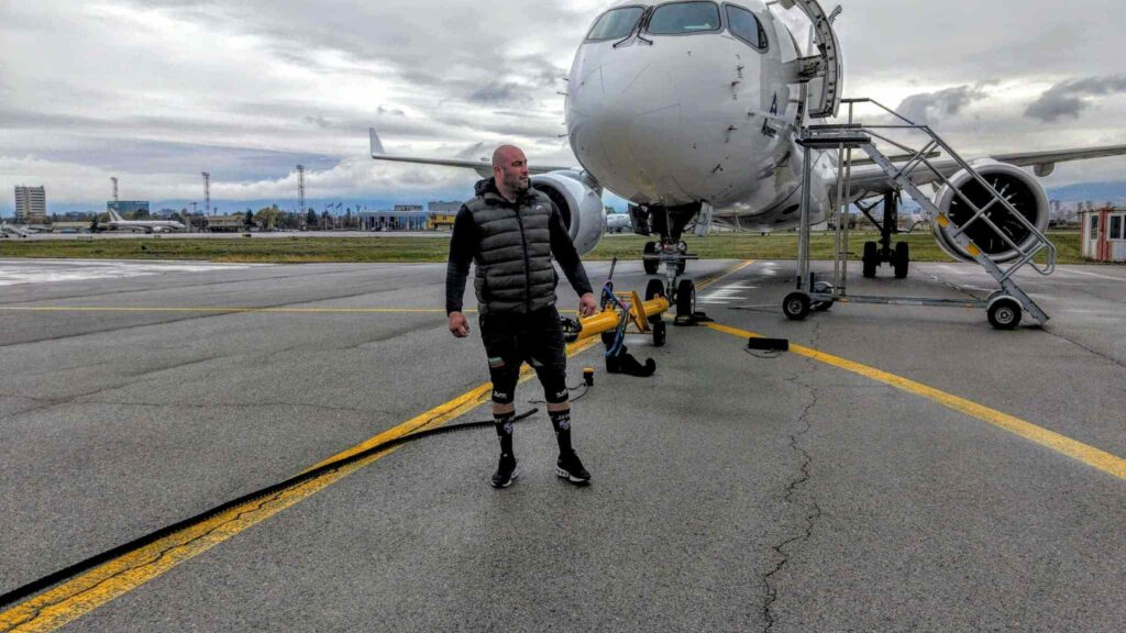 Заявка за зрелищен световен рекорд с теглене на 40 тонен самолет беше направена днес на столичното летище “Васил Левски” от българина Христо Мусков, популярен участник в състезания по силов трибой. След него успешен опит направи и Велизар Митов, който си пожела неговото постижение да бъде вдъхновение за всички българи да спортуват редовно.