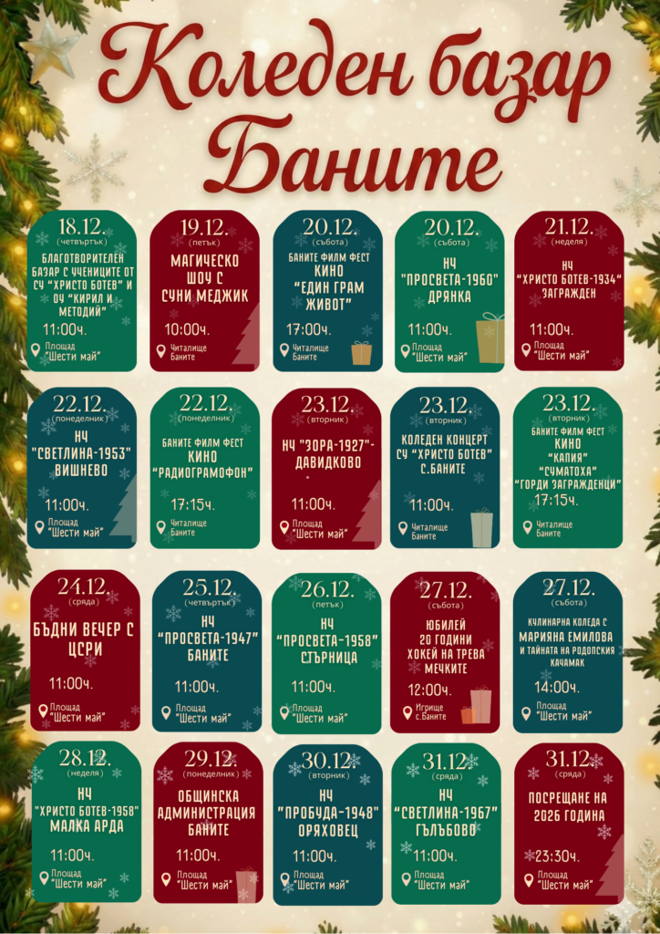 Антипод на градските базари – докато в големите градове коледните базари често се превръщат в скъпо удоволствие, опитващо се да имитира немските „Вайнахтсмаркт”, Баните избира друг път. Пътят на родопската идентичност. Тук няма да видите комерсиален кич. Вместо това, въздухът на площад „Шести май” ще ухае на истински планински чай с билки от региона и ароматите на домашната кухня. Общината прави специален жест към всички посетители – греяното вино, чаят и всички кулинарни изкушения, приготвени с любов от местните читалища, са напълно безплатни. Това е комплимент за празниците – доказателство, че гостоприемството в планината не е стока, а ценност.
