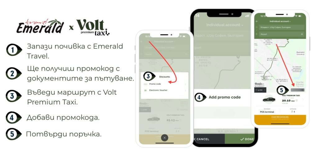 Всеки, който резервира почивка или екскурзия със самолет от София чрез Emerald Travel, ще получи специален промокод за отстъпка при ползване на услугите на Volt Premium Taxi. Така пътниците могат да се възползват от удобен трансфер – от дома си до летището и обратно.