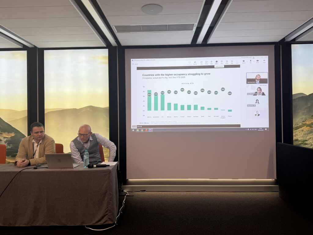 „STR събира и анализира данни за представянето на хотели вече близо 40 години. Работим с над 95 000 хотела по света и проследяваме предлагане на стаи, търсене и приходи, за да разберем какво реално се случва на пазара“, заяви Бейнс в началото на презентацията си. Той отбеляза, че към екипа, отговарящ за Централна и Източна Европа, наскоро се е присъединила и неговата колежка Зоуи, която също се включи онлайн във форума.