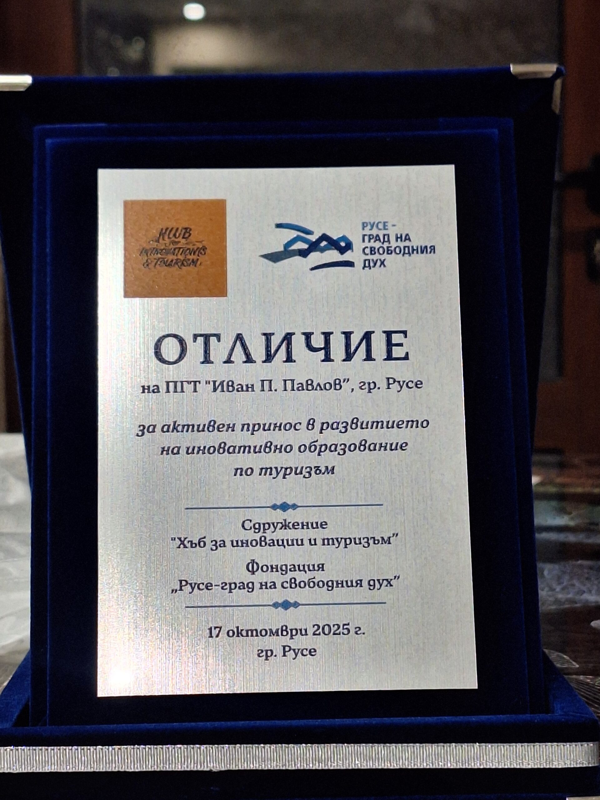 Русе. Пет ученически проекта на туристическа тематика бяха представени на финалното събитие на образователно-менторския проект „Моето Русе. Творческа работилница за туризъм“. В интересна надпревара отбори от ПГТ „Иван П. Павлов“ презентираха идеи, приложими за туризма на града. Четиричленно жури с председател Златомира Стефанова (зам.-кмет на Русе) оценява разработките, а представител в него имаше Съюза на хотелиерите и ресторантьорите в Русе в лицето на Мая Русанова. Деница Неделчева, представител на голяма туроператорска фирма с местен офис и Елеонора Янчева, част от екипа на „Хъб за иновации и туризъм“ бяха част от състава на журито. Петият глас бе гласът на публиката в залата. Идейните проекти на гимназистите бяха оценявани по осем критерия, сред които иновативност, устойчивост, умения за представяне и екипна работа и др. Три от тях бяха и наградени след точкуване, като впечатлиха с оригиналност и изпълниха задачата си да допълнят туристическото предлагане и обслужване в Русе. Учениците демонстрираха способностите си да мислят иновативно, креативно и демонстрираха уменията си да внедряват съвременни технологии.