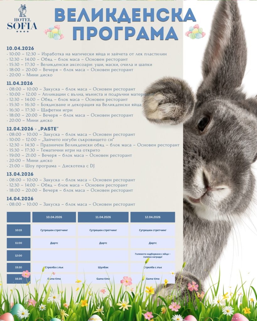 Хотел „София“ в Златни пясъци ще предложи на своите гости за празничните дни комфорт, вкусна кухня и морска атмосфера. Подробна информация за Великденските пакети и резервации за Лято 2026 е налична на официалния сайт на хотела, все още има възможност за резервации. Станете част от атмосферата и чудесната програма на хотела!