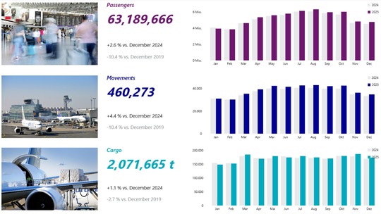 През 2025 г. летищата, управлявани от Fraport по света, са обслужили общо 183,7 млн. пътници – ръст от 5,3% на годишна база. В последния месец на миналата година пътникопотокът в мрежата на компанията достига около 10,4 млн. души, което представлява увеличение от 8,6%. Летище Франкфурт е посрещнало приблизително 63,2 млн. пътници през 2025 г., което е с 2,6% повече спрямо предходната година.