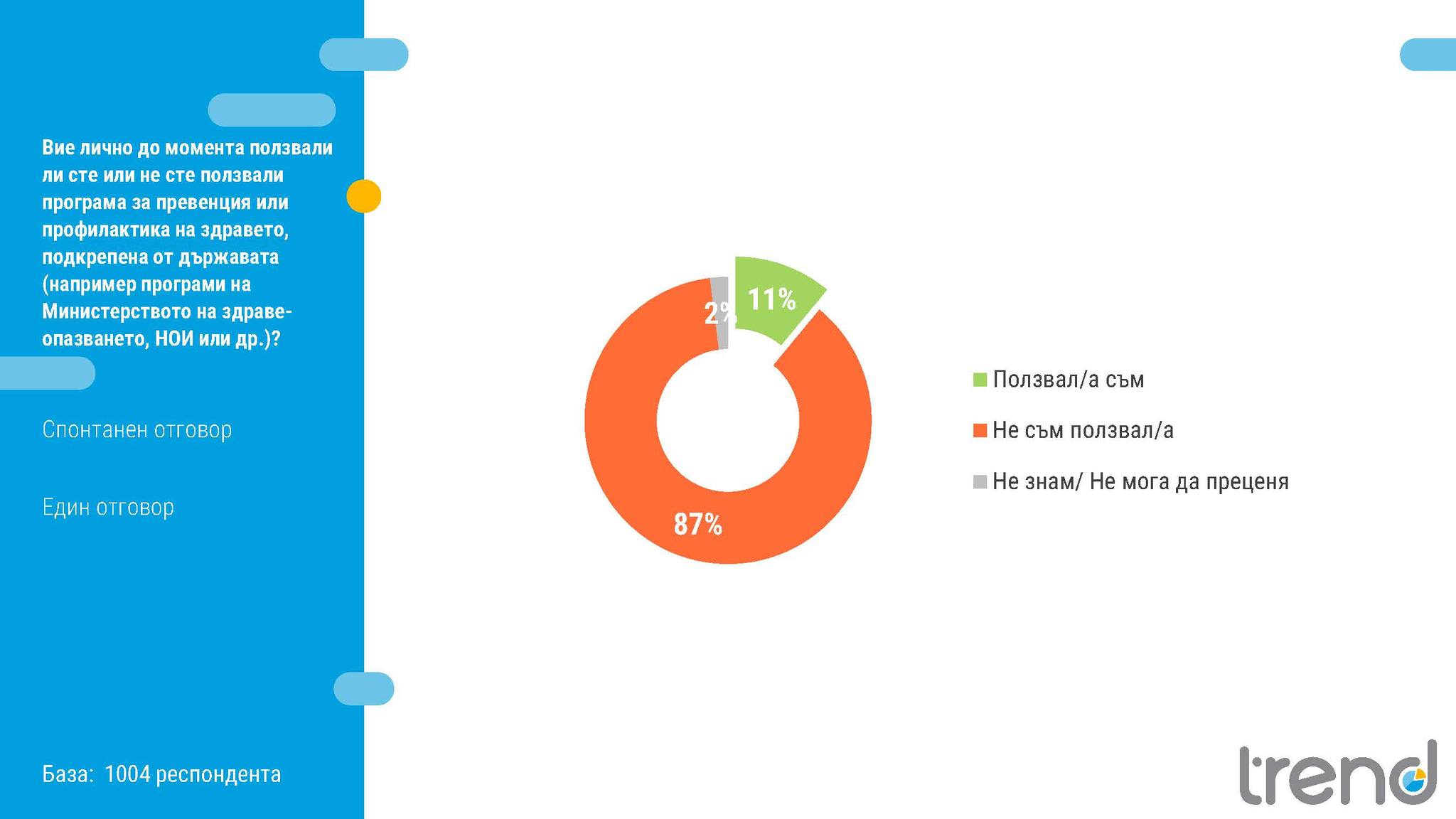 София. 87% от българите не са ползвали програма за превенция или профилактика на здравето, финансирана от държавата. Това показва изследване на агенция „Тренд“, направено по поръчка на „Българския Съюз по балнеология и спа туризъм“/БСБСПА/.