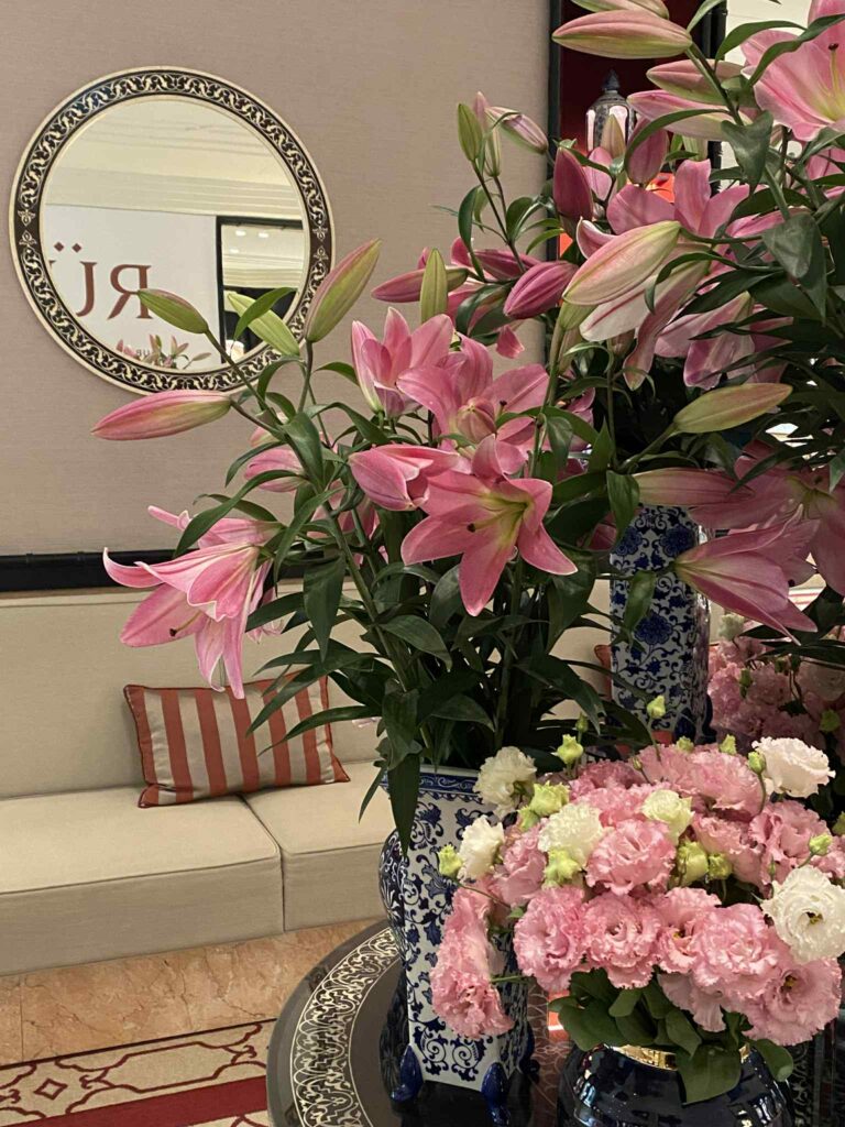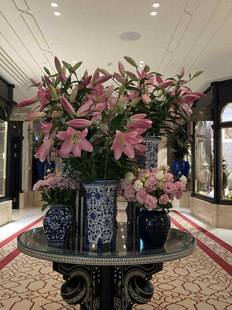 Розови цветни аранжировки красят общите пространства и ресторантите на двореца.