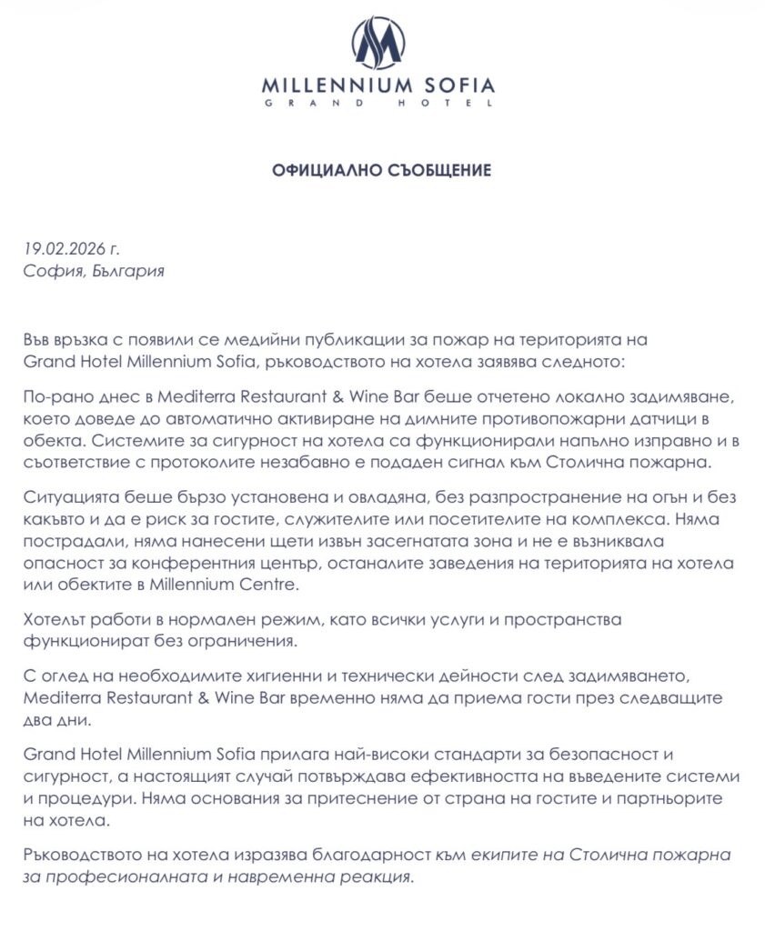 София. Във връзка с появили се медийни публикации за пожар на територията на Grand Hotel Millennium Sofia, ръководството на хотела заявява следното: