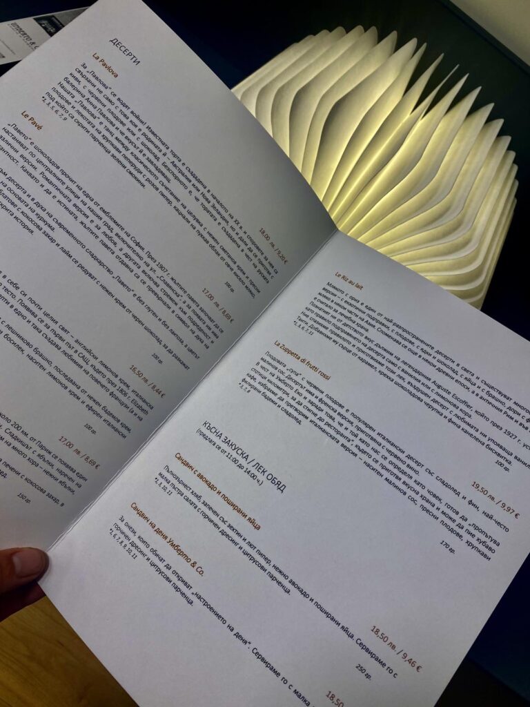 Сред звездите на менюто е „Жълтото паве“. Това е шоколадов десерт, вдъхновен от емблематичните софийски павета. Приготвен без глутен и без лактоза, с естествен цвят от куркума, той е не само вкусен, но и символичен прочит на духа на столицата.